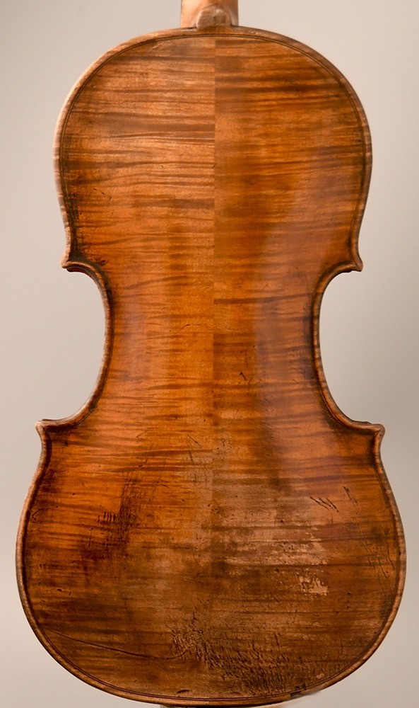 A violin with a beautiful golden - brown antiqued patina (original), fine carved edges and a fine purfling.